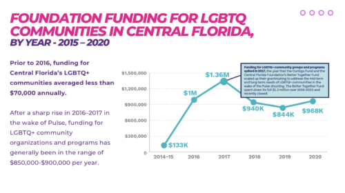 The Contigo Fund and Funders for LGBTQ Issues have conducted an extensive study on the state of funding for the Orlando area’s LGBTQ+ nonprofits and community groups six years after the Pulse massacre left local communities reeling and drew attention from donors and funders around the globe. The purpose of the report is to establish a baseline and measure progress toward building a sustainable ecosystem to address the full needs of the region’s diverse LGBTQ+ communities. It includes data on community needs, funding levels and top funding sources from 2017-2020, and a snapshot of the resources of local LGBTQ+ nonprofits in 2020. Highlights from the report are below. Download and read the report by clicking the button above.