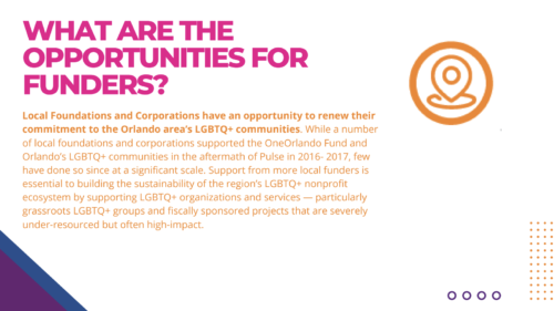 The final section of the report outlines opportunities for funders to support Orlando’s growing, diverse, and impactful ecosystem of LGBTQ+ nonprofits and community groups.